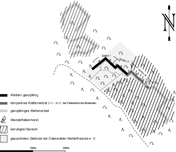sich von den benachbarten Zweibeinern stören zu lassen. Die genannten Merkmale von Ausdehnung und eingeschränkter Sichtverhältnisse treffen auch für das Klettergebiet "Silberwald" im Naturschutzgebiet "Sandsteinbrüche am Burzelberg bei Frau Nauses" zu. Abb. 1 zeigt die Verhältnisse innerhalb des Steinbruchs. Beklettert werden die Sektoren I bis III (in der Karte dunkelgrau und schwarz dargestellt). Nicht beklettert werden alle anderen Bereiche (in der Karte hellgrau dargestellt). Der Wanderfalkenhorst befindet sich auf einem künstlich verbreiterten Felsband im oberen Teil des Sektors IIIb. Wie anhand der Karte ersichtlich ist, ist ab der rechtwinkligen Kante, die die Sektoren IIa und IIb trennt, kein Sichtkontakt mehr vom Horst in die von dort aus gesehen rechts (westlich) liegenden Wandbereiche gegeben. Ferner ist ersichtlich, daß diese Kante nicht identisch ist, mit dem Verlauf der Grundstücksgrenze zwischen dem Teil des Steinbruches, der im Besitz des Vereins der Odenwälder Kletterfreunde e. V. ist und dem landeseigenen Teil. Darüber hinaus ist für eine sachgerechte Beurteilung der Situation vor Ort noch von Bedeutung, daß erstens zwischen den Sektoren IIb und IIc ebenso wie zwischen den Sektoren Ib und IIa jeweils ein die Sicht zusätzlich behindernder Erdwall als Relikt der Abbautätigkeit existiert. Zweitens, daß die Sektoren Ia bis IIb vollständig von hohen Bäumen überragt werden, währendessen die Sektoren IIIa und IIIb auf staatlichem Grund freigestellt wurden, um dem Wanderfalken eine Einflugmöglichkeit zu bieten. Gleicht man die Verhältnisse in diesem Steinbruch ab mit den vorliegenden Erkenntnissen über das Verhalten von Wanderfalken an Kletterfelsen, so führt dies unzweideutig zu dem hiermit beantragten Sperrungskonzept: