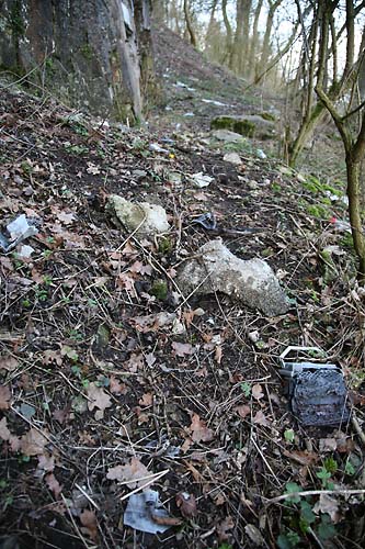 Der Wandfuß bietet ein Blick des Jammers:Das Müllbiotop am Konradsfels.