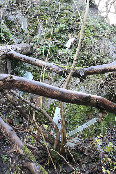 Ein Konvolut Kunststoffplatten verteilt sich über den westlichen Wandfuß. Der Baum im Vordergrund wurde vermutlich ebenfalls illegal bei der Freistellungsmaßnahme der Gemeinde Villmar von oben in das Naturschutzgebiet geworfen.